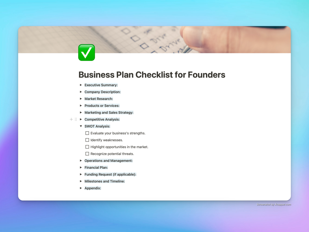 Why did I create this Notion template? Because I understand the importance of a well-structured business plan in turning ideas into thriving ventures. This comprehensive Business Plan Checklist is designed to empower entrepreneurs, startup founders, and small business owners in crafting strategic roadmaps for success.