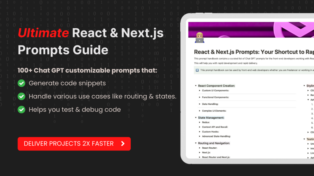 Unlock the full potential of React and Next.js with our 'Ultimate React & Next.js Prompts Guide.' This comprehensive guide is your ultimate shortcut to rapid project delivery and enhanced development skills.